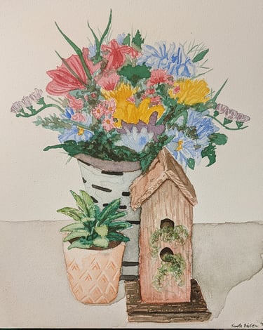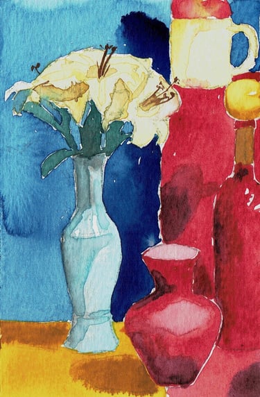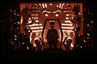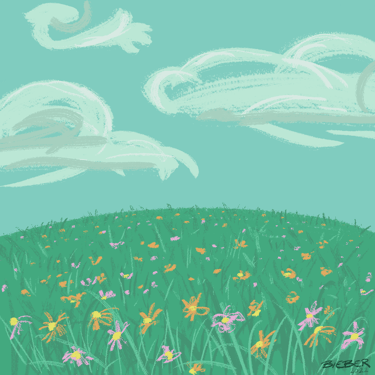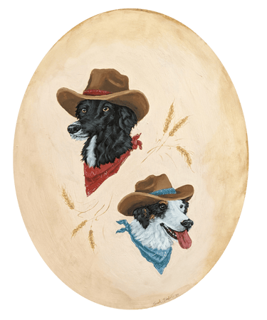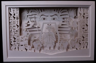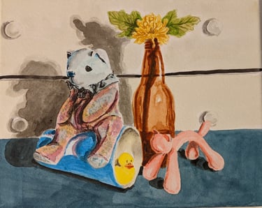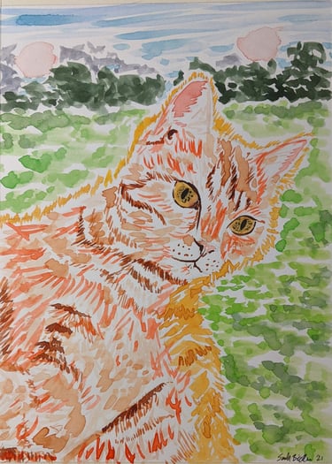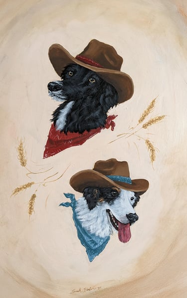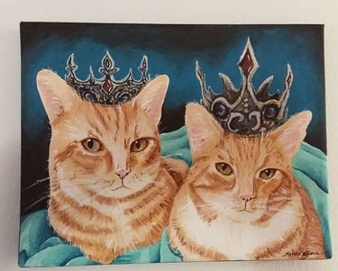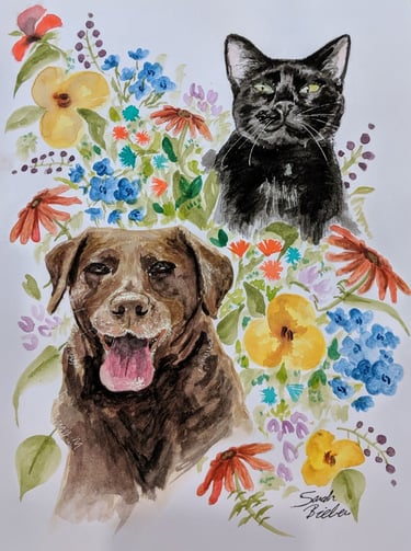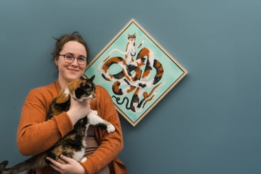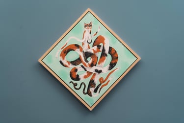 Playful poses, colors, and animals within traditional art sets such as watercolor, acrylic, digital art, and 3D paper scultpure.